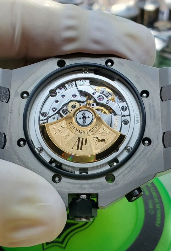 A full service (Overhaul) encompasses thorough disassembly, cleaning, lubrication with synthetic oils according to Swiss watchmaking standards, gasket lubrication, part inspection, minor repairs, case and bracelet ultrasonic cleaning, steam cleaning, timing regulation to multiple positions utilizing dynamic poising, and more. For a complete list of details on what’s included in the base service, please read more here.